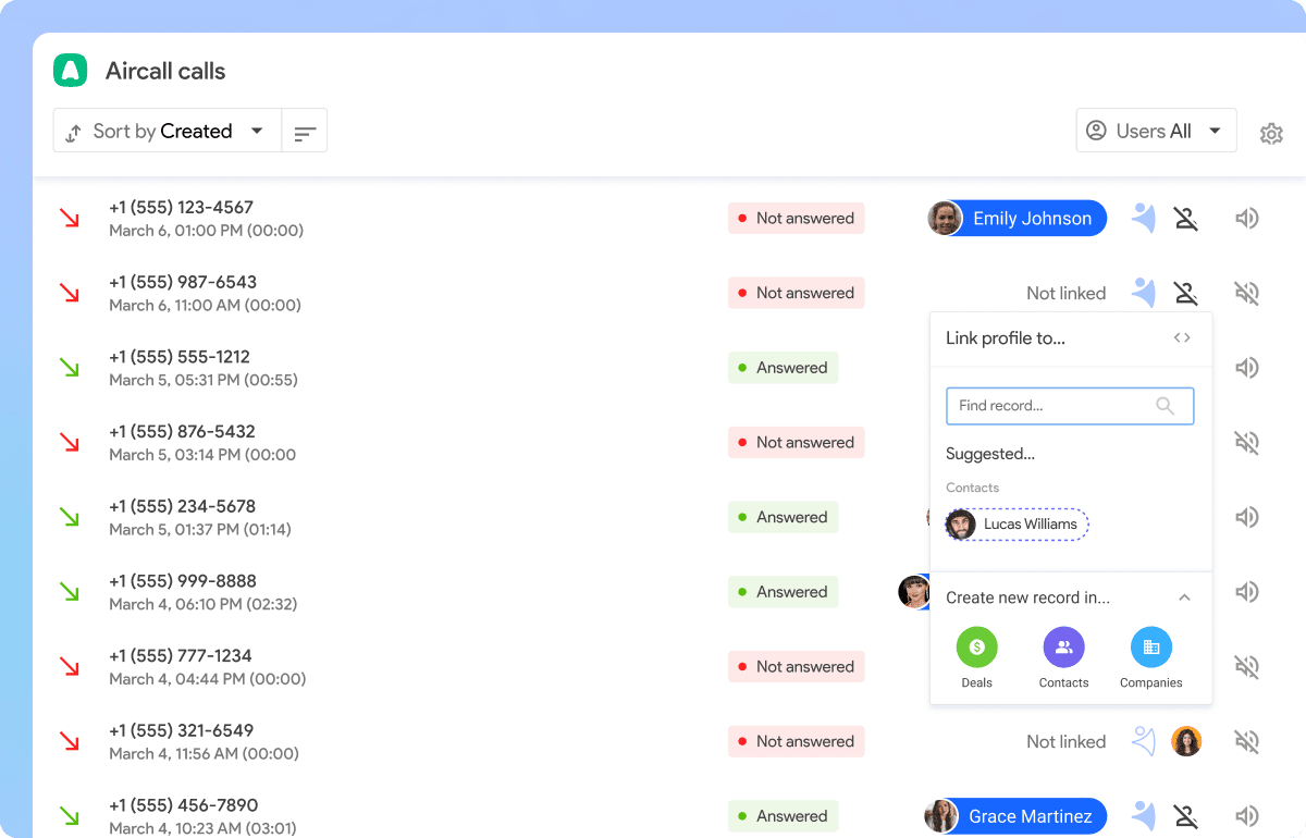 NetHunt CRM now integrates with Aircall, enabling users to manage calls directly from within the CRM. This new integration further blurs the lines between communication and sales operations by introducing: